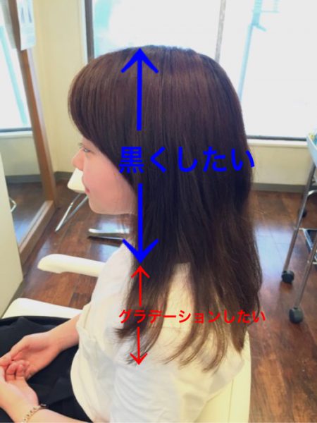 今回はカラーのご予約ですが、これから幼稚園での実習が始まるので「黒染め」をしなくてはいけないとのとこです。