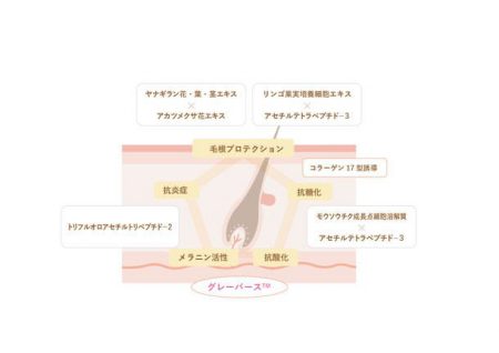 メラニン活性や抗酸化に作用する「グレーバース(TM)※」を中心に、頭皮環境改善をもたらすシナジー成分を開発。頭皮環境改善のために中心となるアセチルテトラペプチド-3のはたらきで、毛包のエイジングケア、毛根の保護を行い、細胞シグナルを誘導。その他の成分で、抗酸化・抗炎症効果をもたらし、頭皮から毛包の環境を整えることで、シナジー効果を発揮する処方です。なお、本技術については知財化を進めています。※パルミトイルテトラペプチド-20