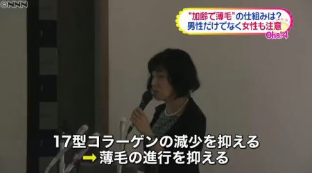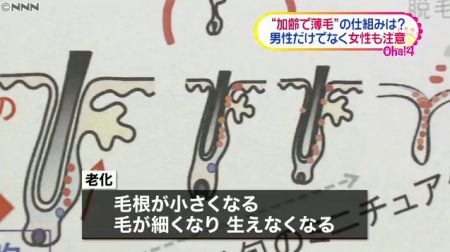 西村教授は「加齢で髪の毛が薄くなる仕組みがかなり分かってきた。コラーゲンの 減少を抑える治療薬の候補となる物質を探し、数年以内に動物実験を行ったうえで ヒトでの臨床試験に結びつけたい」と話しています。