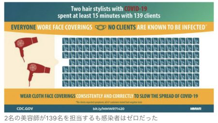グリーン群保健局が追跡調査を行ったところ、2人の美容師から施術を受けた139名の内、確認のとれた104名及び、その二次接触者、そしてヘアサロンで働く同僚、誰一人として感染していなかったことが判明した。CDCがヘアサロン内での感染を防ぐため効果を発揮したと結論付けているのが、マスクだ。