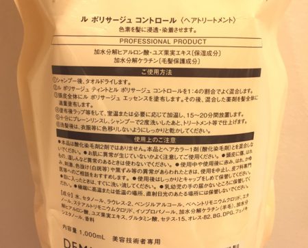 商品としては通常のヘアカラーのように1剤(ティント)と2剤(コントロール)を(1:4)の割合で混ぜるタイプのカラー剤になります。
