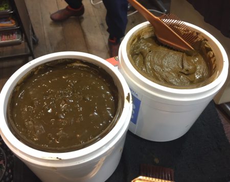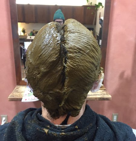 僕もお手伝いしながらたっぷりの沖縄産ヘナを塗布しました。