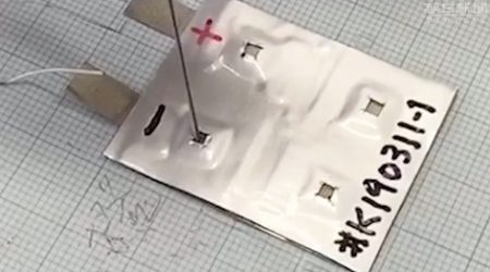 改良を重ね、約2センチ角、厚さ1ミリ程度の小型燃料電池に仕上げた。4個をつなげ、5ミリの四角い穴に注射器で尿素を注入すると、約3ボルトの電圧が発生し、LEDをともせることを確認した。