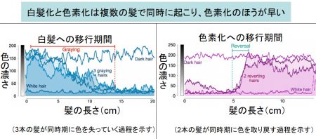 上の図では、白髪化、あるいは色素(黒髪)化している毛が、それぞれほぼ同じ時期に変化を開始したことを示しています。