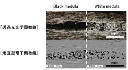 特徴として「White medulla」は、「Black medulla」と比べて中央の繊維状構造が太く、空洞も半分以下になっている事が判明。