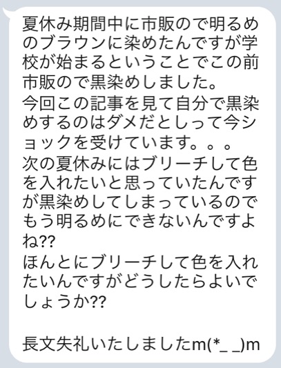 今回この記事を見て自分で黒染めするのはダメだとしって今ショックを受けています。。。