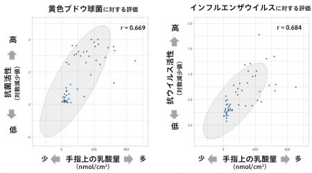 手指に乳酸量が多くなるほど抗菌活性が向上することを確認され、手汗から分泌される『乳酸』が特に重要であることがわかりました!
