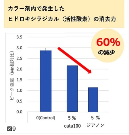 ヘアカラー施術時に発生する 活性酸素(ヒドロキシラジカル)を60%以上減少させるという試験結果が出ています。