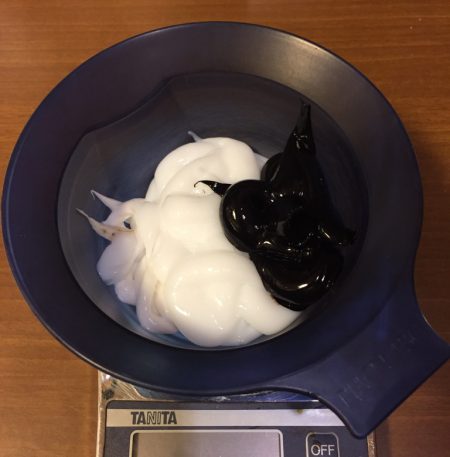 ということで、今回も白髪染め1剤と過酸化水素の2剤に塩基性HC染料を混ぜ合わせたハイブリッドカラーを使用していきます。