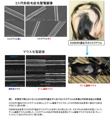 そして、円形脱毛症患者のCCHCR1遺伝子のリスクアリル(*3)をゲノム編集法(*4)でマウスに導入したところ、円形脱毛症の患者と類似の症状を再現することに成功しました。