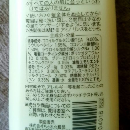 これは化粧品の成分と分量を公開してくれている良心的なメーカーの「ちふれ」さんのシャンプーです。