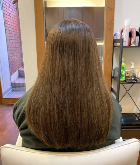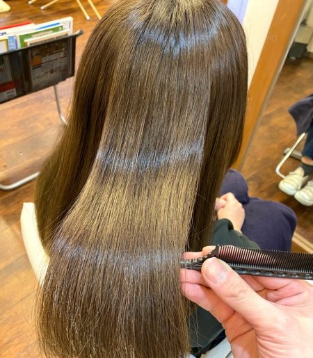 シャンプー後、トリートメントKPXとツヤ髪トリートメントで後処理を行いました。
