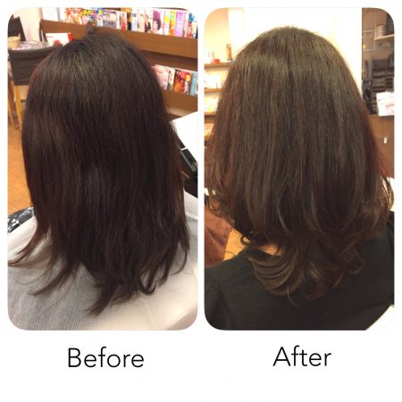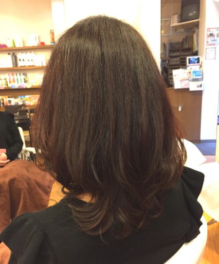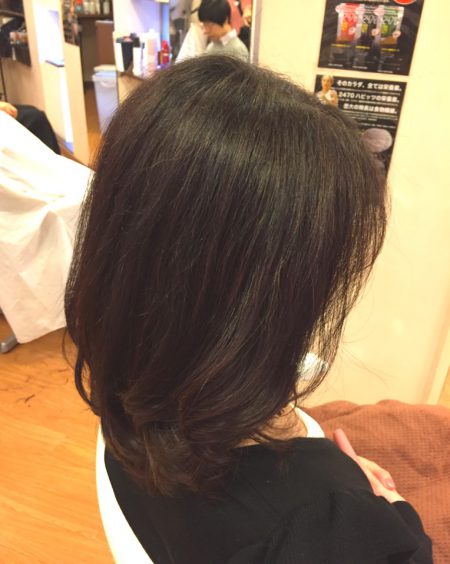 ハチ上なのど広がりやすいところは縮毛矯正をしておいて毛先にはパーマをあててあげると今回のようなスタイルも朝から楽チンになりますよ。