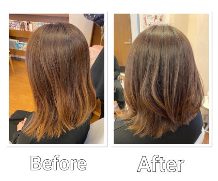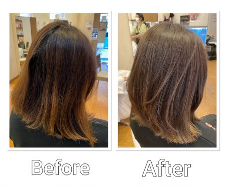 色味もノンジアミンヘアカラーで寒色系の色をさせていただいていましたが、流石に褪色してしまって黄色っぽくなってしまっているので、