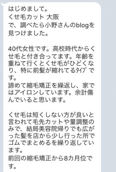 で、調べたら小野さんのblogを見つけました。40代女性です。高校時代からくせ毛と付き合ってます。年齢を重ねて行くとくせ毛がひどくなり、特に前髪が縮れてるタイプです。