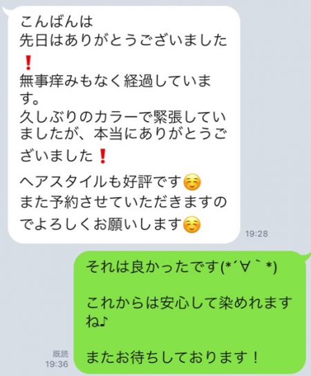 画像見る限り大丈夫そうですし、お客様も何ともなかったとのことなので、これで1つ安心してカラーリングをすることができます。
