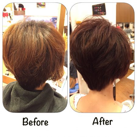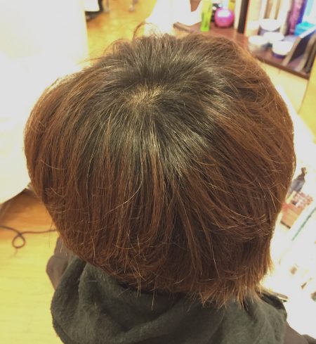 根元が伸びて黒いのがめだってきてますね。ちらっと白髪があるもの気になってきているそうなので、そこも目立ちにくいようにカラーをしていきましょう!