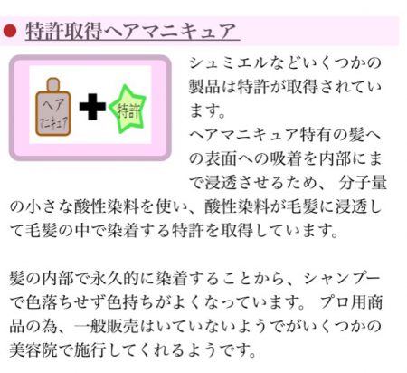これを読む感じでは、普通のヘアマニキュアは髪の毛の表面にくっついているだけですが髪の毛の内部にまで浸透するようになっているようです。