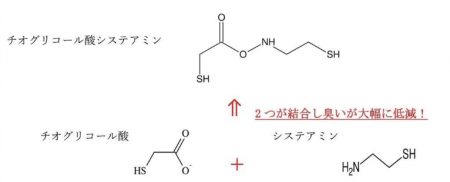 臭いの原因となるシステアミンの末端にあるNH2が、チオグリコール酸とシステアミンが分子結合することで分子の中間でNHになるため臭いの発生が大幅に低減しました。