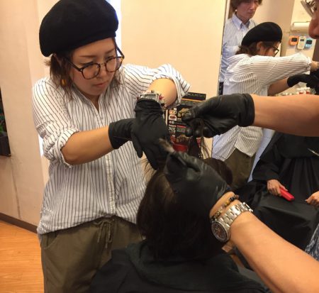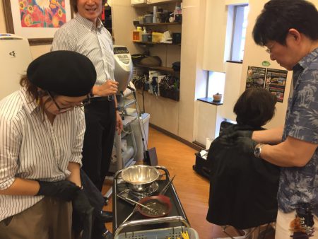 インストラクターさんの指導の下に「和漢彩染」を調合し、カラーリングしていきます。